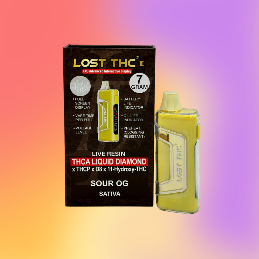 The LOST THC III comes with 7 grams of a blend of Live Resin, THCA Liquid Diamond, THCP, Delta 8, and 11-hydroxy-THC. It has an advanced interactive display and features a vape time per pull, voltage level, battery life indicator, oil life indicator, and a clogging-resistant preheat function.