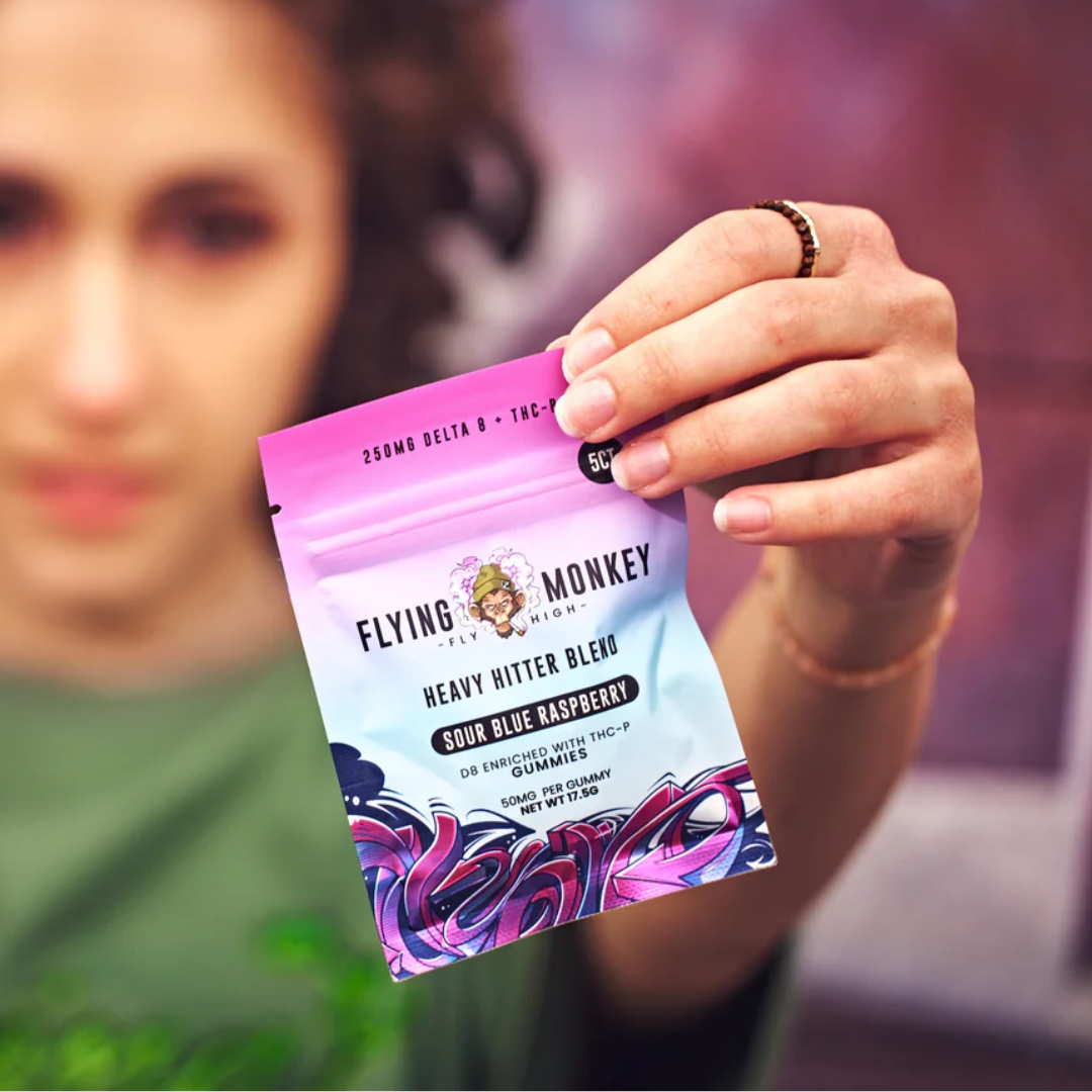 The Heavy Hitter Blend Gummies by Flying Monkey features 250mg of a Delta 8 THC + THC-P blend and mouth-watering flavors. Each gummy contains approximately 50mg, and the serving size is one gummy per use, which should be more than enough. There are five gummies per pouch and they are lab-tested to ensure you get a clean and safe product.